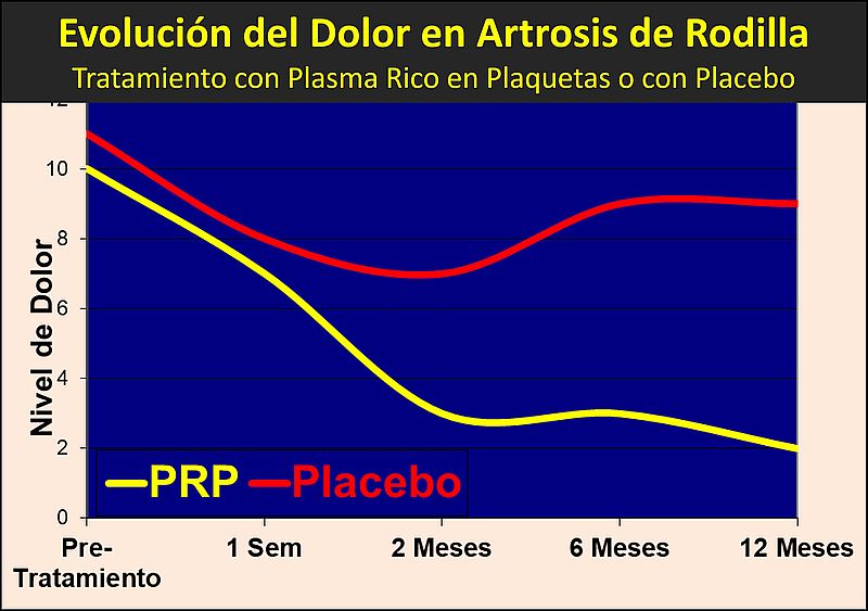 En el gráfico de la derecha basado en los datos del estudio, se aprecia la evolución del Dolor en ambos grupos. Como se puede apreciar, antes de comenzar el tratamiento el nivel de dolor era similar en ambos grupos y a partir del control de 2 meses tras el tratamiento se aprecia una diferencia significativa entre ambos grupos. El grupo de pacientes con artrosis de rodilla tratados con Plasma Rico en Plaquetas refieren un nivel de dolor mucho menor que el grupo de pacientes tratados con placebo. Y ese dolor se mantiene en un nivel bajo y mucho menor que en el grupo placebo en los siguientes controles realizados a los 6 meses y 12 meses de terminado el tratamiento. Según este estudio, el tratamiento con Plasma Rico en Plaquetas en pacientes con artrosis de rodilla, trae consigo una disminución significativa del dolor.